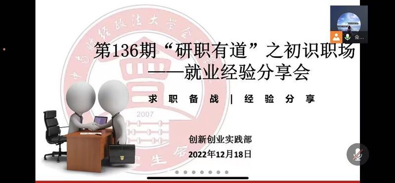 为帮助广大研究生更全面掌握求职技巧,实现更多元的发展和更高质量的就业,由会计学院研究生会承办的第136期“研职有道”之初识职场——就业经验分享会于12月18日晚成功举办。本次活动邀请了连仕祺、张惠鑫、刘煜千三位同学进行经验分享。
