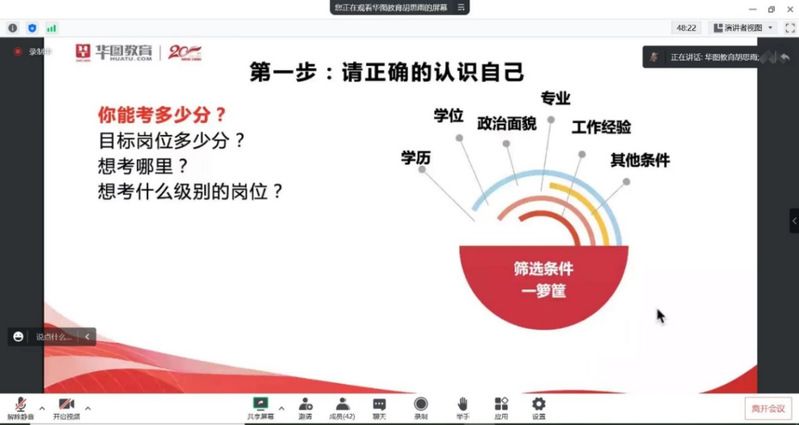 为了响应国家对优秀毕业人才应深入基层,勇担时代责任,为国家的发展做出贡献的号召,我院在省考报名临近之际,于1月13日成功举办第139期“研职有道”之初识职场——2023湖北省公务员报考指导讲座,加深同学们对公务员考试的认识。本次讲座以腾讯会议的形式线上进行,邀请了华图教育胡思雨老师为大家进行分享与指导。