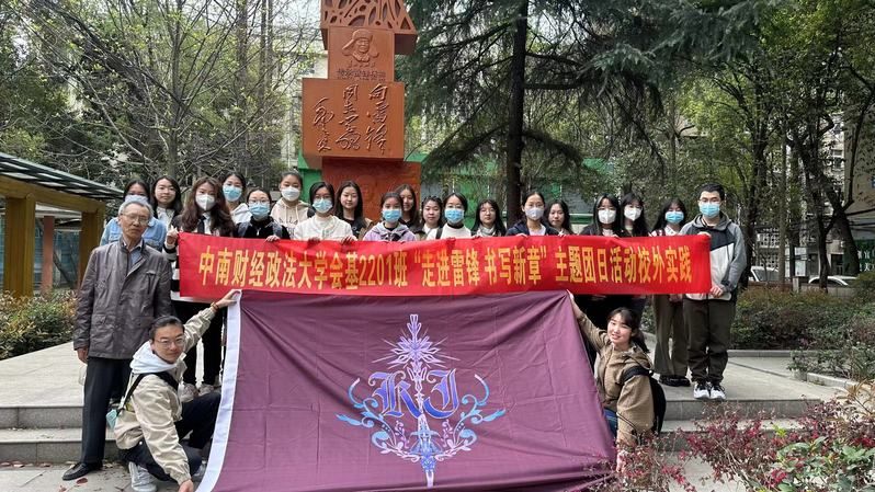 活动第三项,合影留念。团支部成员与黄德宝老先生于井南社区的“向雷锋同志学习”纪念碑下合影,用镜头记录下此次难忘的实践探访经历。