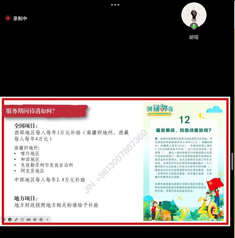 新闻网讯(学生通讯员 黄亦欣 摄影 樊成锦)为进一步加深同学们对于大学生志愿服务西部计划的了解、引导更多青年学子以实际行动投身乡村振兴事业和西部建设,会计学院团委于5月16日以线上会议方式召开校2023-2024年度西部计划招募宣讲会。校团委组织部长胡瑢、西部计划优秀志愿者代表及有意向了解参与西部计划的共计80人参加本次宣讲会。