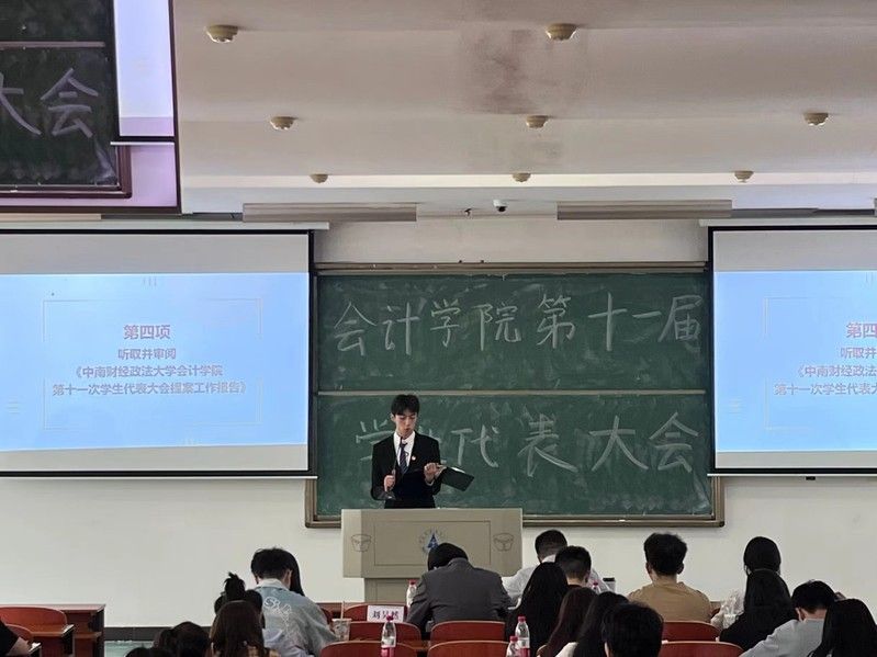 会议第四项,学生代表听取并审阅由会计学院学生会主席团成员刘昊然的宣读《中南财经政法大学会计学院第十一次学生代表大会提案工作报告》,提案内容主要包含学校建设、学术学务、生活服务、民族学生事务等方面,具有广泛代表性。