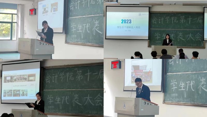 与会学生代表表决通过《关于会计学院第二十三届学生会工作报告的决议(草案)》、《中南财经政法大学会计学院第十一次学生代表大会选举办法(草案)》、《中南财经政法大学会计学院第二十四届学生会主席团候选人建议名单》和《中南财经政法大学会计学院第十一次学生代表大会选举唱票人、监票人、计票人建议名单》。之后,王天奕、向闿黎、惠飞悦、张艺涵依次上台竞选会计学院第二十四届学生会主席团。
