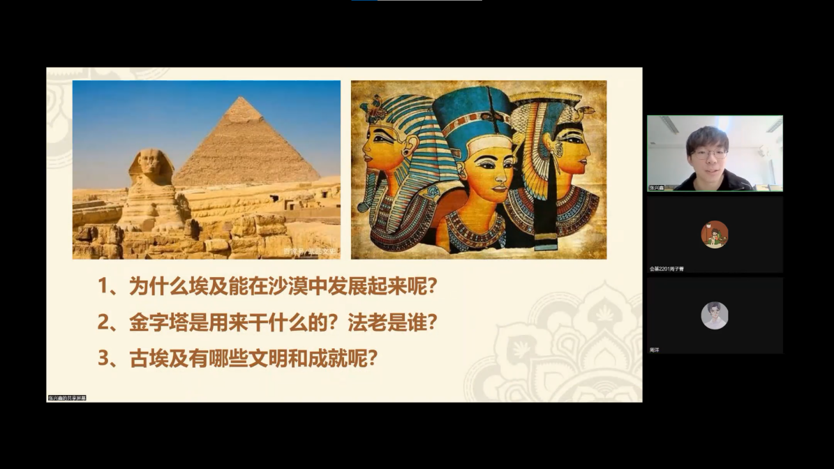 2023年3月30日下午4点30分,中南财经政法大学会计学院四年级云课堂第二小组通过腾讯会议为箭坝小学四年级学生进行时长一小时的四大文明古国课外历史课,主讲人张兴鑫、周子菁。