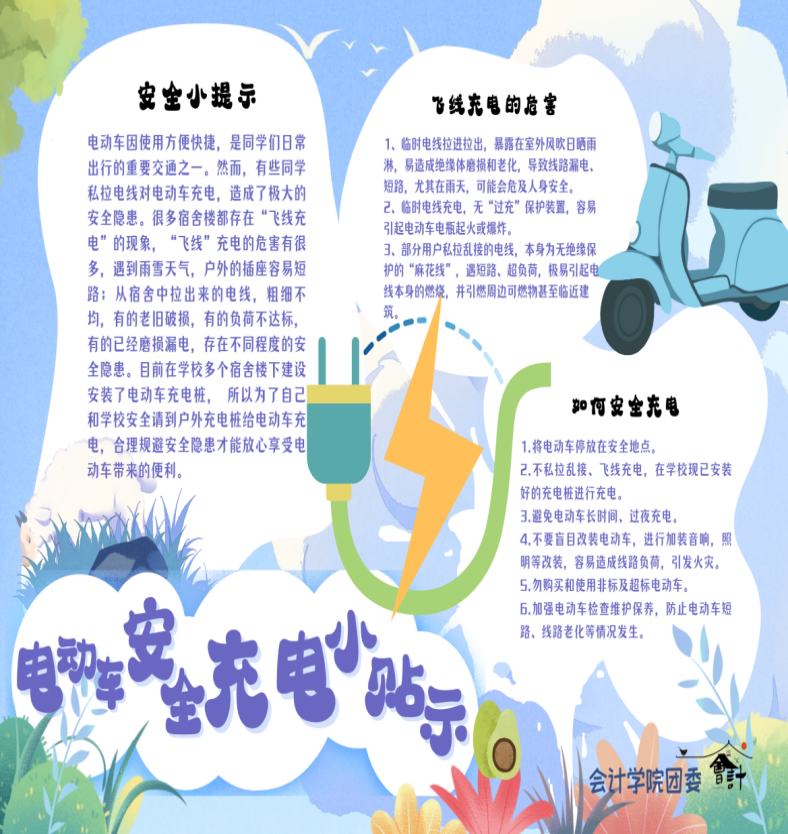 平安校园需要你我携手共建,学校目前已基本实现电动自行车集中充电设施全覆盖,下一阶段将集中稽查“飞线充电”行为,会计学院本科生将服从学校安全管理,一起为平安校园的建设贡献力量。(通讯员:陈立志、胡牧孜)