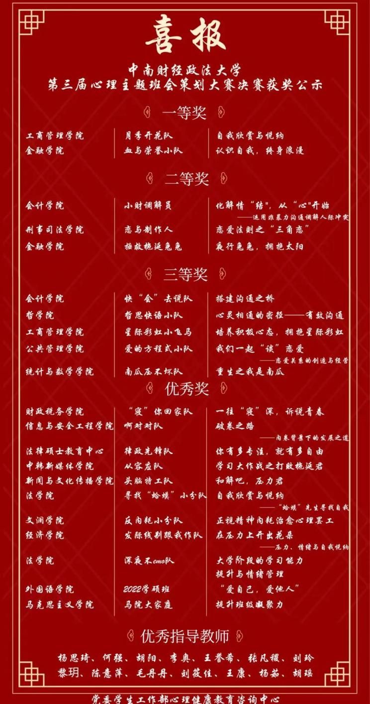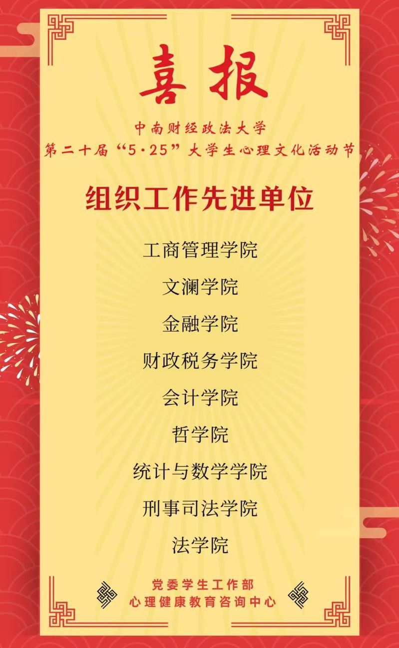 (通讯员 黎玥)为落实立德树人根本任务,进一步加强“心理育人”工作,传递心理健康理念,培育学生理性平和、积极向上的阳光心态,促进学生全面健康发展,我院积极组织参加中南财经政法大学第二十届“5· 25”大学生心理文化活动节系列活动,喜获佳绩。