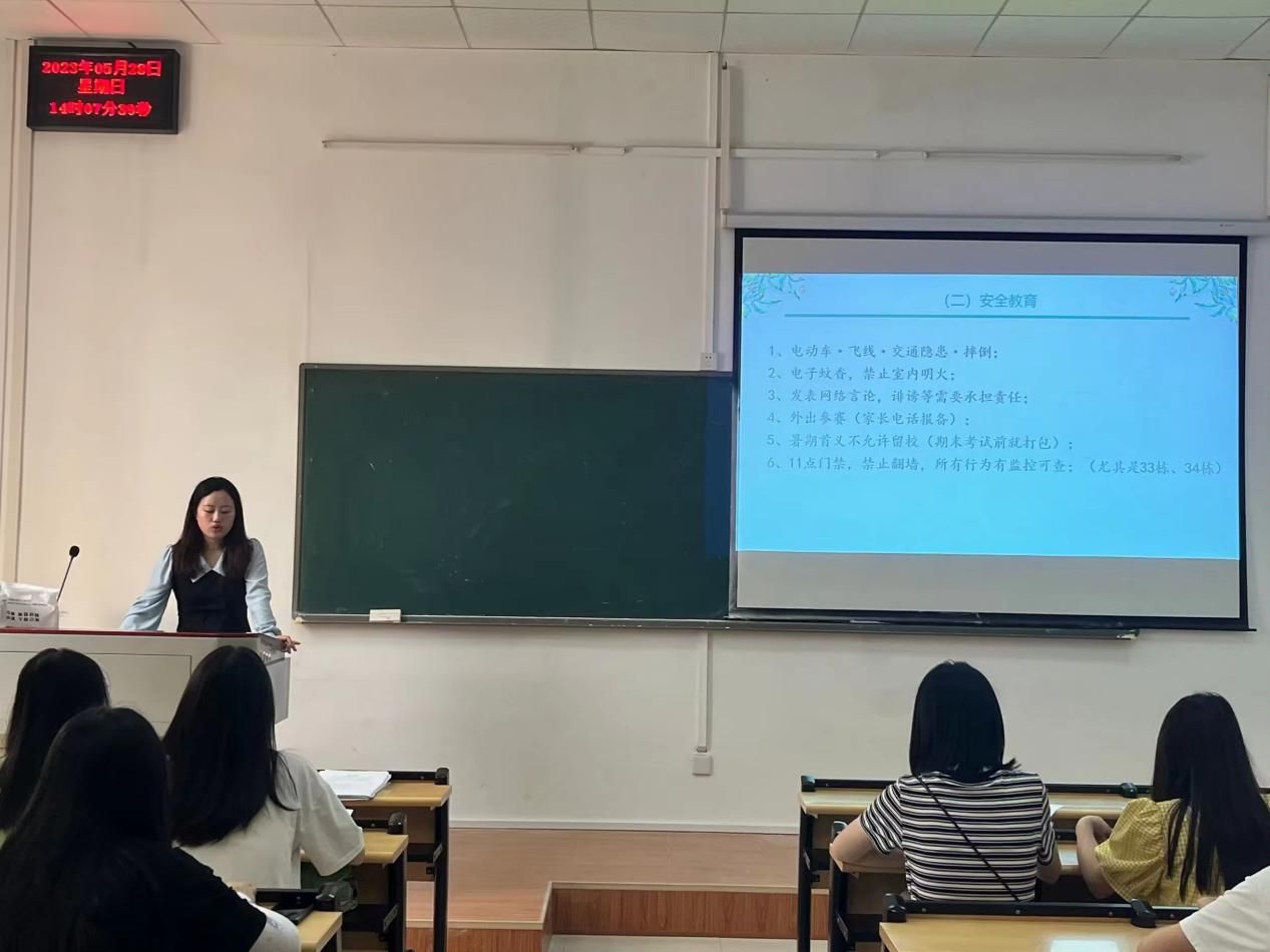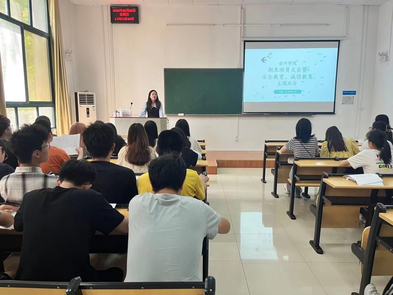(通讯员 顾轩榕 李紫萱 黎玥)5月28日下午2点至6点,会计学院本科22级以行政班为单位分别举行了期末考试动员大会暨安全教育、诚信教育主题班会。本科22级年级主任、辅导员黎玥出席各班班会,开展了诚信教育、安全教育,并进行了期末考试动员和近期工作部署。