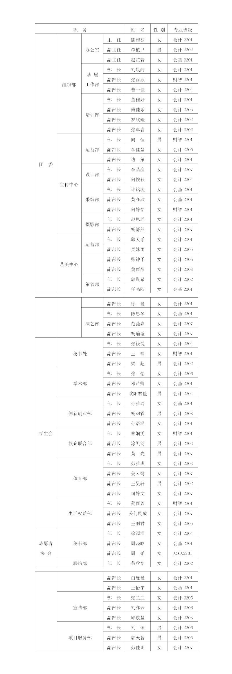 经自愿报名、资格审查、竞聘考核、民主评议、综合考察等程序,会计学院团委研究,拟录用以下候选人为会计学院第二十四届团学组织内设部门负责人,现将具体名单予以公示: