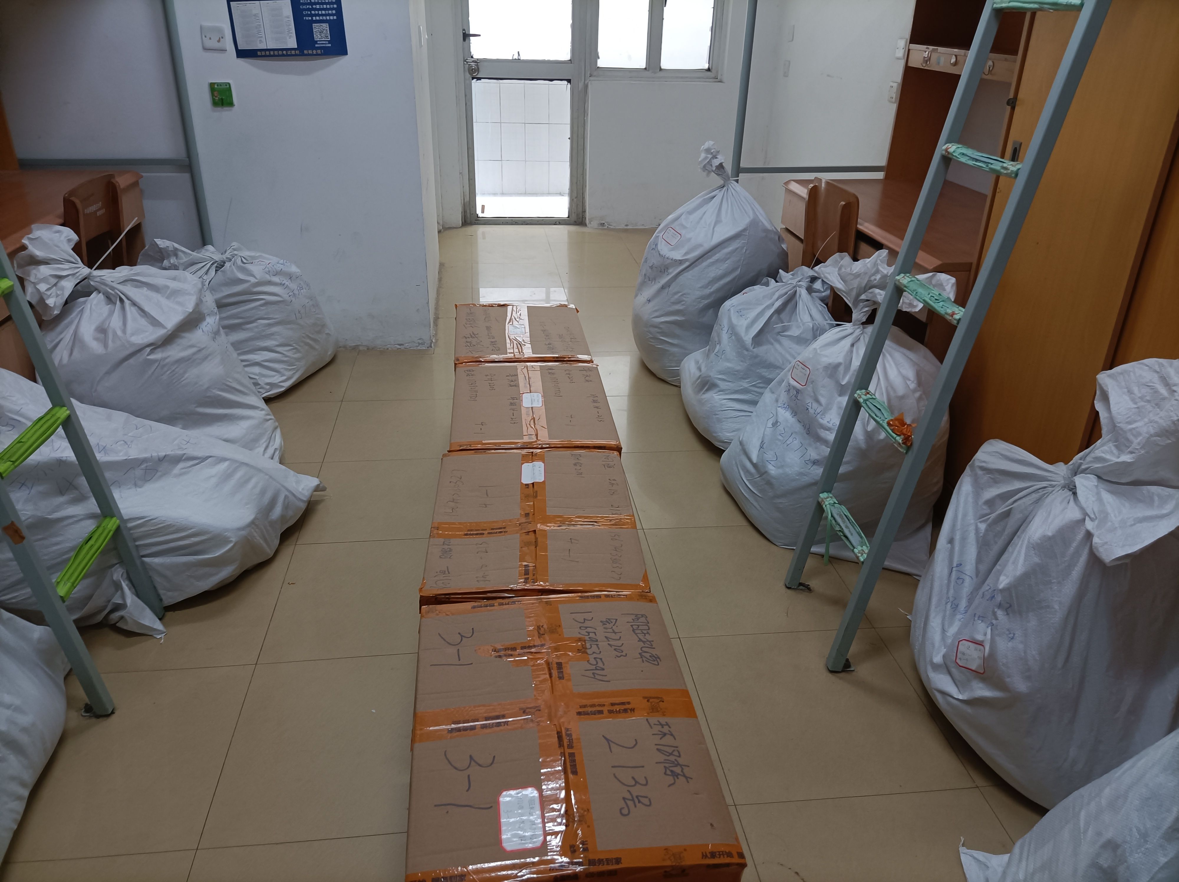 6月29日上午,辅导员黎玥和各班搬家负责人在宿舍楼下集合,与搬家公司负责人同到各个寝室核对包裹数量、交接行李、张贴封条,完成与搬家公司的最后交接。