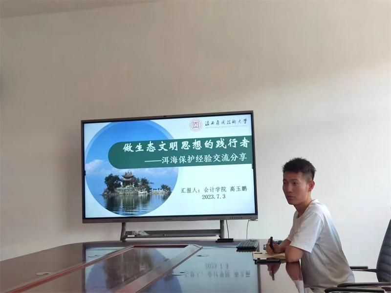 会议由挖色镇洱海保护工作队成员滇西大会计学院高玉鹏进行介绍和分享,滇西大会计学院副院长、中南大援派滇西大挂职干部吴卫华、中南财经政法大学会计学院团委书记赵达骋,及苍洱青年志实践队韩骏腾、陈濯、董稚妤、刘晨菂、熊雅芬参与。本次分享会主要介绍了洱海的基本情况、相关政策及洱海保护队的工作重点三个部分。