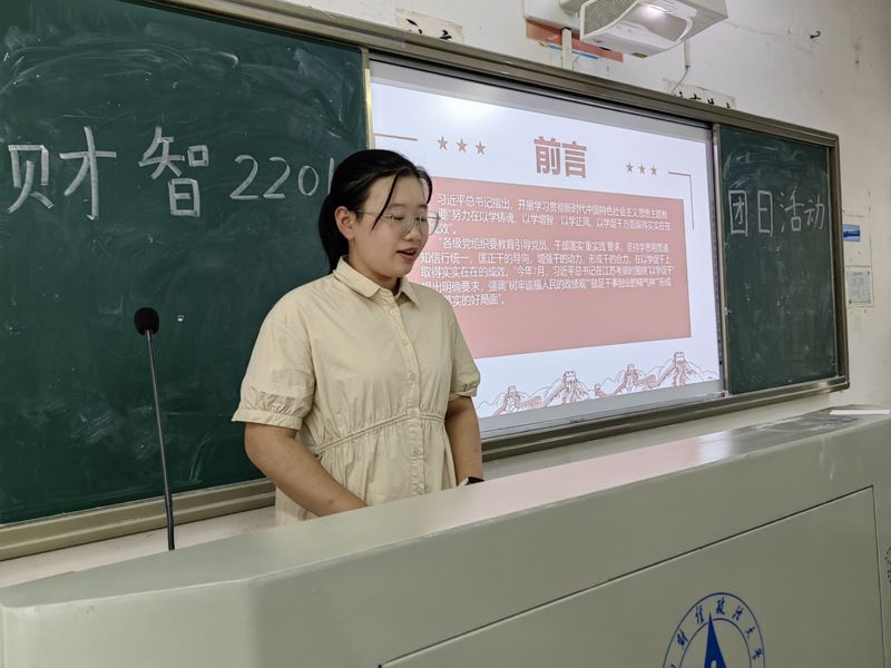 活动第一项,财智2201团支部团支书林涵进行微团课演讲,呼吁全体团支部同学们思悟党的决策智慧,紧随党的引领,高举中国特色社会主义伟大旗帜。团支书的言辞恳切,引导支部同学们踔厉奋发、挺膺担当。