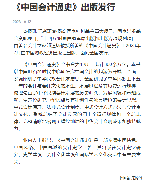 国家社科基金重大项目、国家出版基金资助项目、“十四五”时期国家重点出版物出版专项规划项目,由著名会计学家、我校郭道扬教授所著的《中国会计通史》于2023年7月由中国财政经济出版社出版,面向全国发行。多家媒体进行了报道。