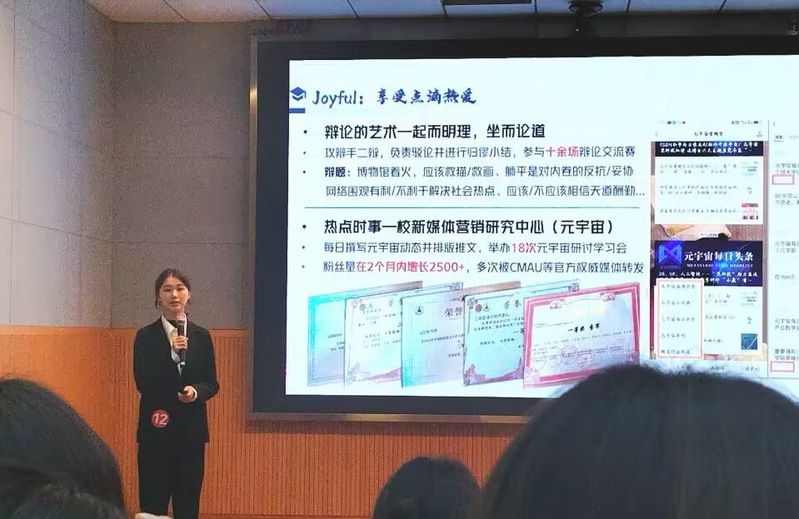 与往年不同,本届比赛在赛制上做出了较大创新与改动,分为个人风采展示和模拟竞争投资两个大环节。在个人风采展示环节中,十二位选手们大方得体,妙语连珠,以PPT、短视频等形式,呈现了自己的学习经历、兴趣爱好,优势特长等,向观众展示多彩自我。