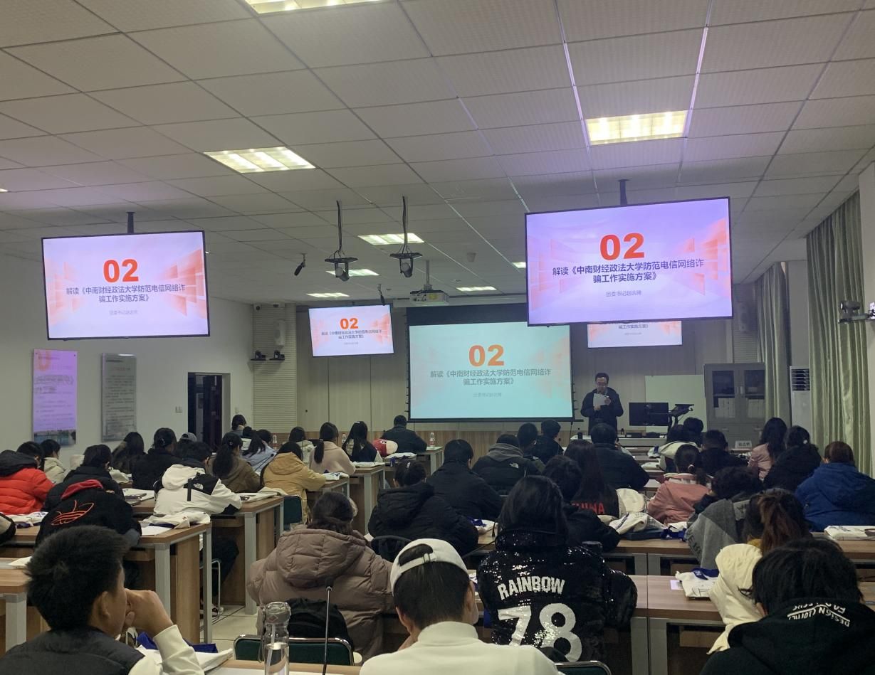 随后,会计学院团委书记赵达骋解读《中南财经政法大学防范电信网络诈骗工作实施方案》文件精神,通过讲解学校相关规章制度,普及常见的诈骗手段以及学生被骗后的处理方法,在同学们心中树立了”电诈可防“的理念。