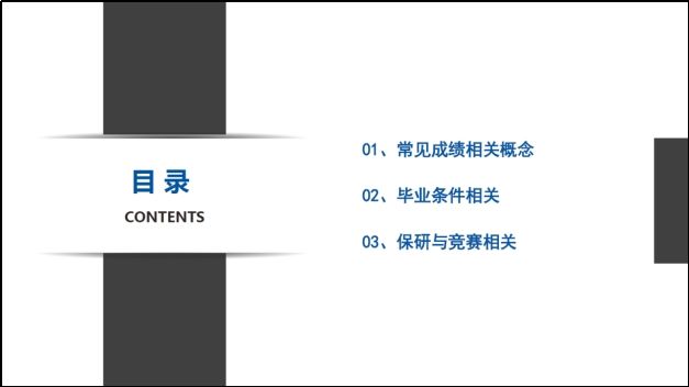 辅导员助理吕光楠根据前期学情调研中同学们反馈的问题,讲解了与大学生活密切相关的规则与概念。例如学习成绩的不同计量方式,与毕业相关的体测、二课、实习实践、论文要求,并介绍了保研的条件和流程、各类竞赛的重要意义,鼓励各位师弟师妹积极参与实习实践,提升自我能力。