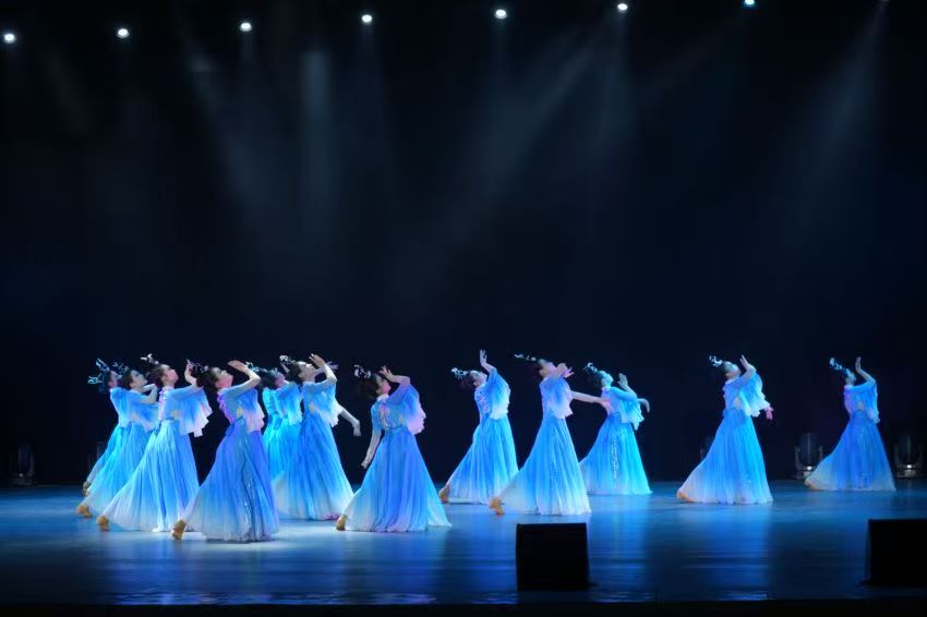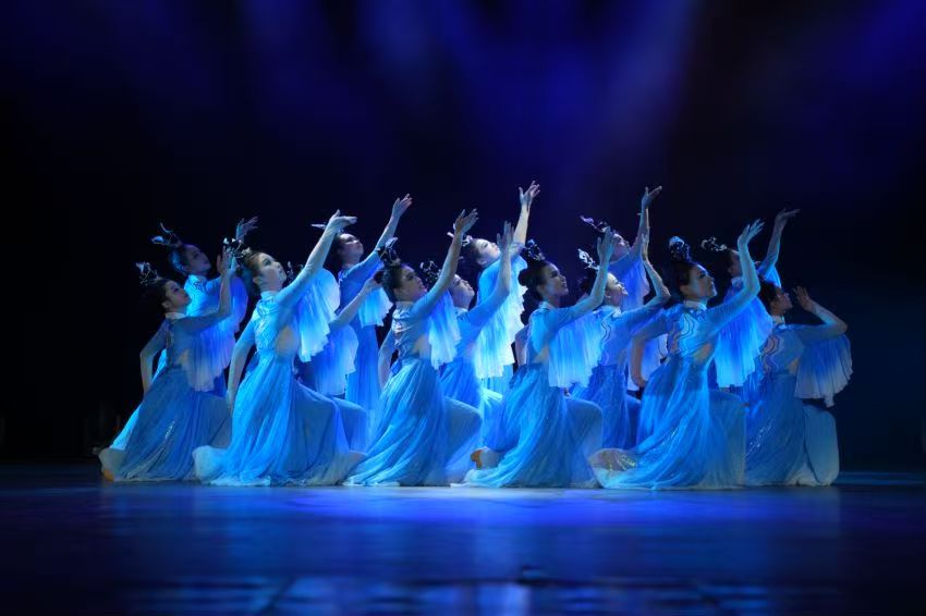 表演伊始,一人于月光下翩翩起舞,独舞温婉又不失灵动。其他舞者围成曲线,似水波起伏,铺展出一幅婉约桂林山水画。随着乐曲进度,独舞转群舞,优雅中透着一丝俏皮,展现了江南佳人于月下起舞的雅致景象。巧笑倩兮,美目盼兮,娉娉袅袅,婀娜多姿。一曲惊鸿,一舞蹁跹,道不尽风情百转。
