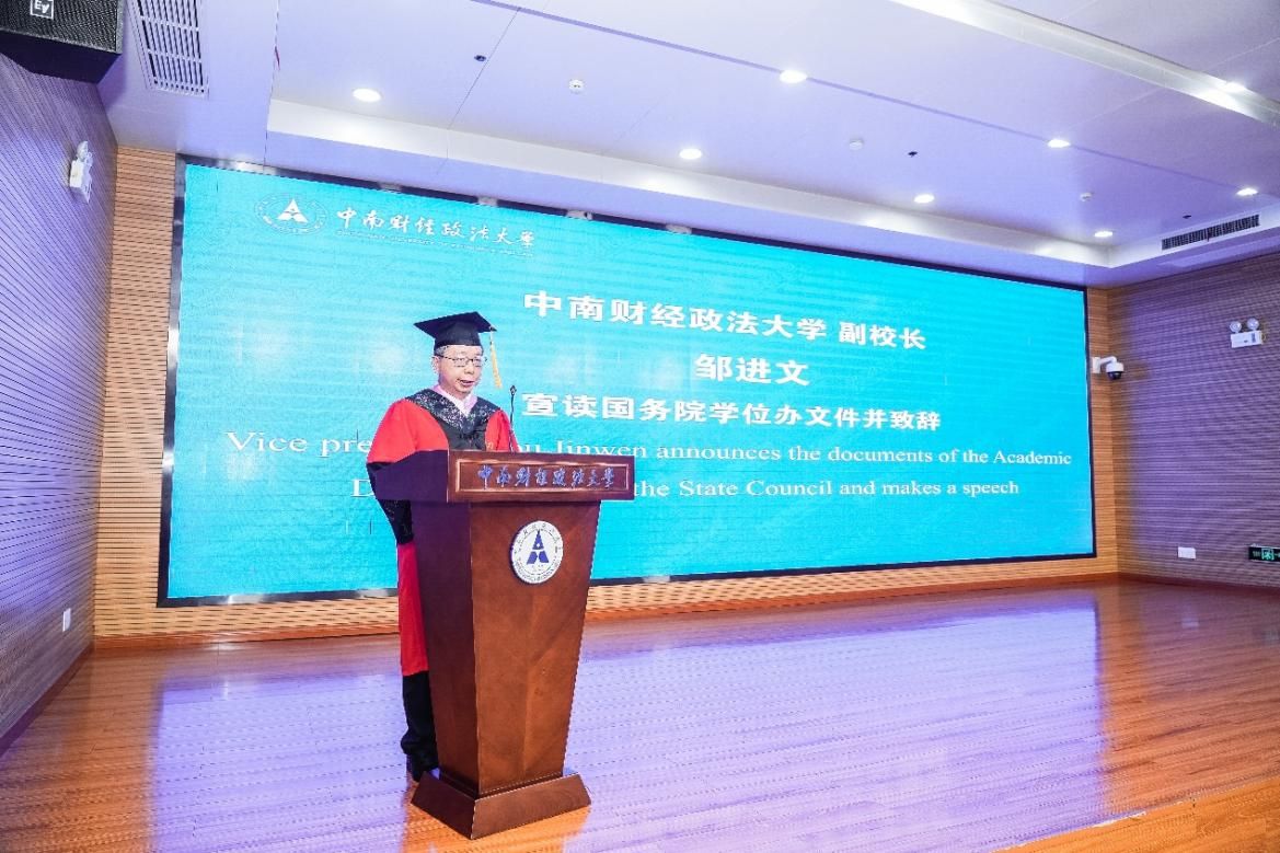 国际著名会计史学家、文澜资深教授郭道扬教授,意大利邓南遮大学马西姆·萨基亚科姆教授(Massimo Sargiacomo),安东尼奥教授(Antonio Gitto),中南财经政法大学校长、校学位委员会主席杨灿明教授,校党委常委、副校长覃红教授,副校长邹进文教授出席学位授予仪式。研究生院院长胡弘弘,党委办公室、学校办公室副主任李晓,党委宣传部副部长邓松,国际交流部副部长李奕,会计学院党委书记周勇,副院长王昌锐、冉明东、李四海,教职工及学生代表参加仪式。仪式由覃红副校长主持。