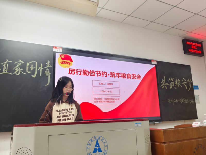 新闻网讯(学生通讯员 刘依婷)为响应会计学院团委号召,会计2404班于10月22日下午在文泽楼103教室举行团日活动并且圆满落幕。此次团日活动以“厚植家国情怀,青春告白祖国”和“厉行勤俭节约,筑牢粮食安全”为主题,旨在引导同学们增强家国意识,培养勤俭节约的良好品德。