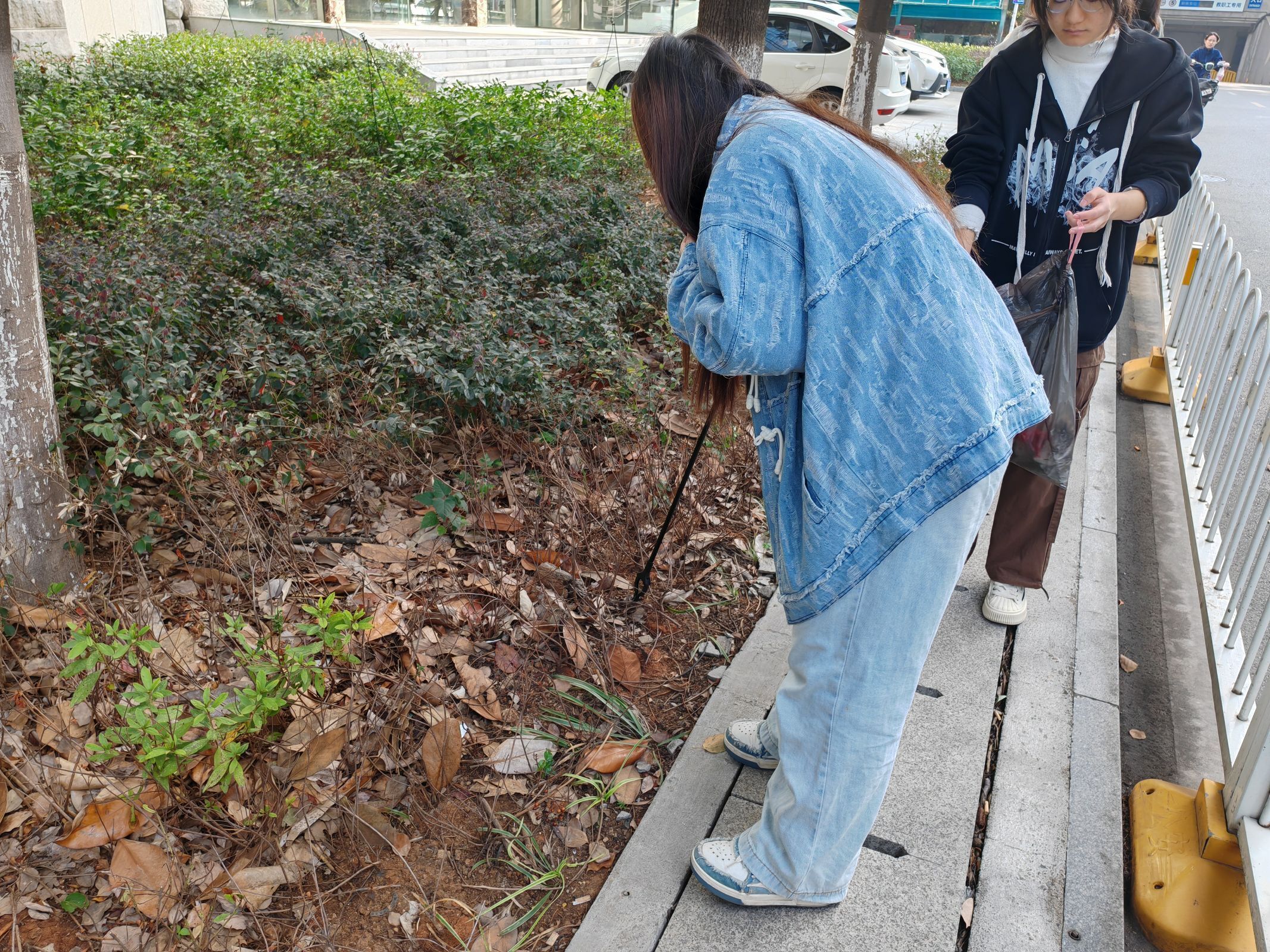 在首义校区,会计学院地志愿者们主要负责思园和31号楼及附近区域,志愿者们对指定区域内环境卫生地清洁与维护事无巨细,他们手持垃圾夹,细细寻觅,弯腰捡拾出潜藏于草叶间地烟蒂、纸屑,隐匿在角落地塑料残片,认真为校园地清洁美丽作出贡献。