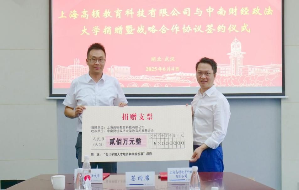 (通讯员:林涵)2025年6月4日上午,上海高顿教育科技有限公司(以下简称“高顿教育”)与中南财经政法大学捐赠仪式在中原楼六楼会议室顺利举行。高顿教育董事长兼首席执行官李锋、校党委常委、副校长、会计学院院长张琦出席仪式。仪式由校友工作与社会合作部部长、教育发展基金会秘书长笪宁主持。