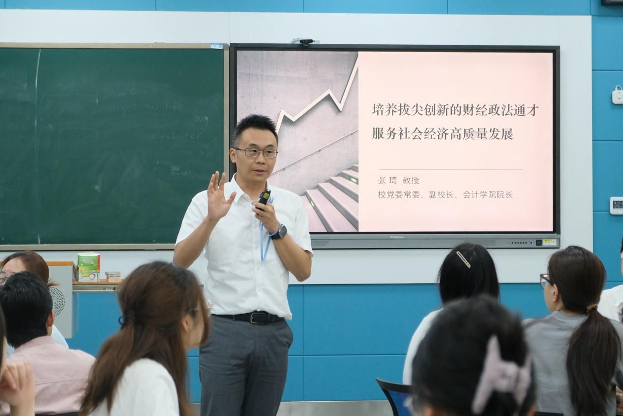 6月3日下午,校党委常委、副校长、会计学院院长张琦教授在文波楼203教室,为会计学院2022级本科生讲授主题为“培养拔尖创新的财经政法通才,服务社会经济高质量发展”的思政课。张琦教授以自身经历为生动范例,引导同学们聚焦自身成长,激发奋进力量。本次思政课主要分为三个部分:一是为何需要通才;二是为何需要财经政法通才;三是如何培养拔尖创新的财经政法通才。