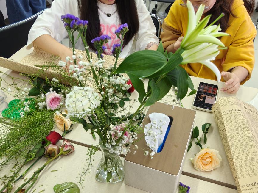 在插花艺术环节,支部成员系统了解了东方式、西方式及现代插花的不同风格特点,拓宽了审美视野。随后,同学们分组动手实践,利用准备好的花材、花瓶等物资,亲手创作插花作品。大家在协作中交流创意,在动手中感受美好,进一步体会到乡村振兴带来的生活之美与发展之机。