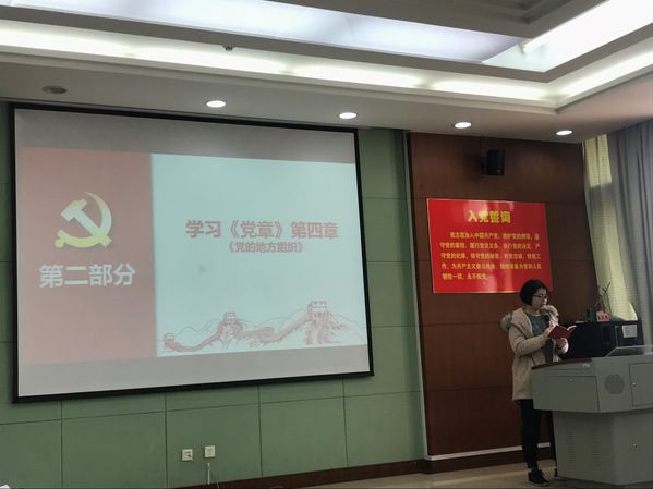 活动开始,陈亚男同志带领同志们重温入党誓词。接着,由邓玮同志带领全体党支部同志学习《中国共产党章程》第四章——《党的地方组织》。《中国共产党章程》宣读完毕后,支部全体成员现场缴纳三月份的党费。