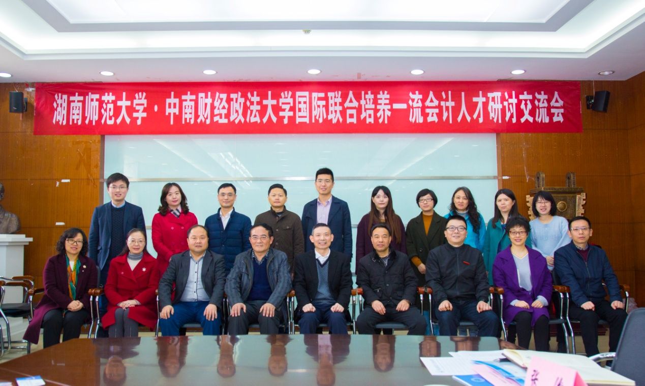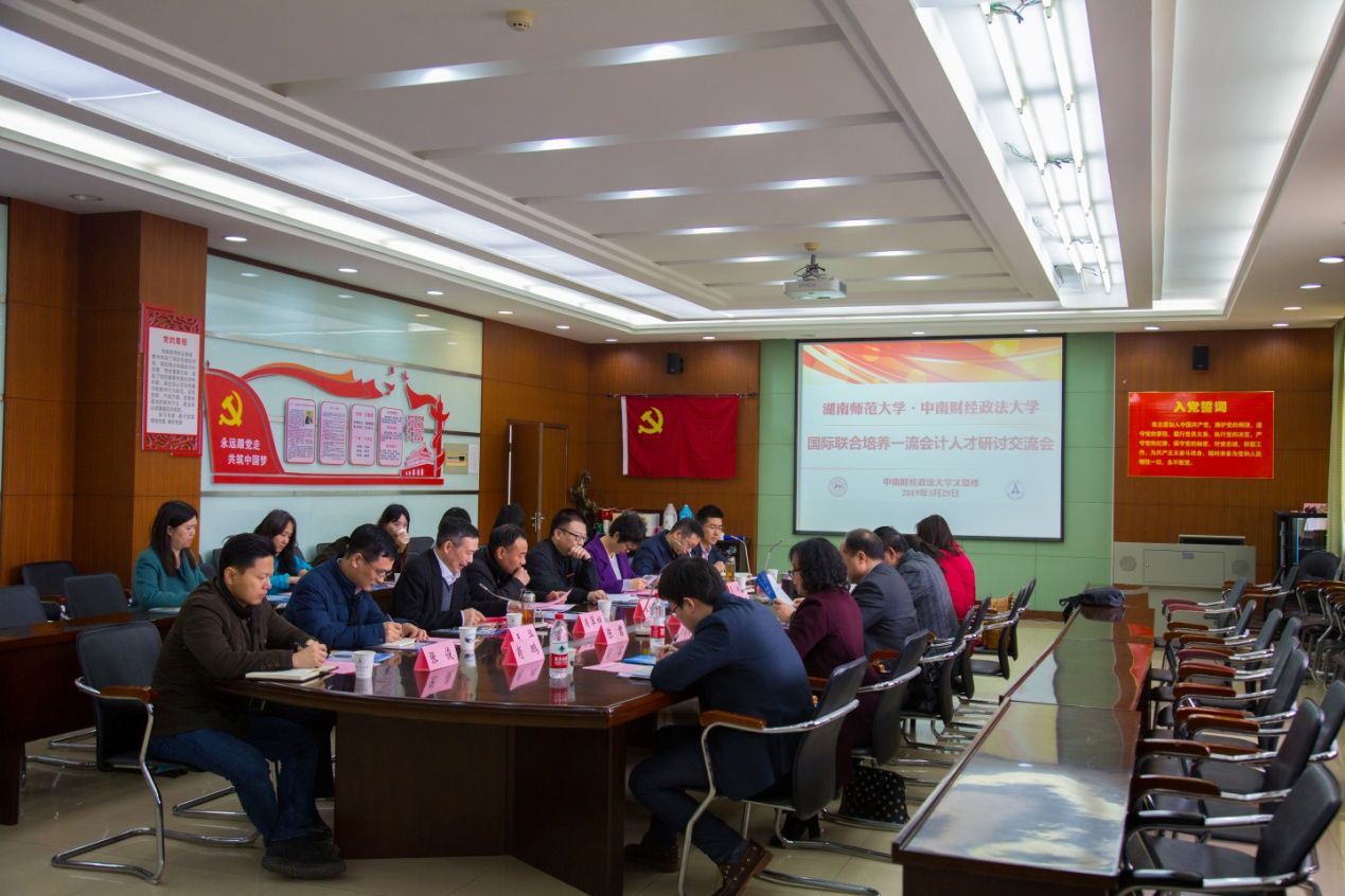 (通讯员 郝曼宇 尹思琦 赵侃 徐会超)2019年3月29日,湖南师范大学与中南财经政法大学在文泉楼南401会议室举行“国际联合培养一流会计人才”研讨交流会。湖南师范大学教务处评建办主任李新年、财务处副处长宋玖林、国际交流合作处副处长李苗、商学院副书记陈君、招生与就业指导处考试科科长李灿华、商学院辅导员兼外事秘书肖鹏,我校办公室副主任王前哨、学生工作部副部长葛明、教务部副部长王良圣、财务部副部长尹红军、国际教育学院办公室主任汪正君,会计学院党委书记肖翠祥、副院长王华及教师代表参加了会议,会议由肖翠祥书记主持。