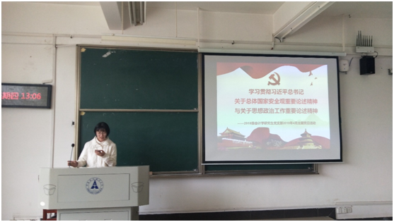 在现场交纳党费、重温入党誓词、诵读党章节选等环节后,梁含嫣同志为全体党员讲授《习近平新时代中国特色社会主义思想三十讲:第二十三讲坚持总体国家安全观》主题党课,她强调,总体国家安全观承载为实现中华民族伟大复兴提供坚强保障的历史使命,具有鲜明的时代特色,支部全体党员要牢固树立“四个意识”,坚持总体国家安全观,锐意进取,为实现“两个一百年”奋斗目标和中华民族伟大复兴的中国梦作出新的贡献。