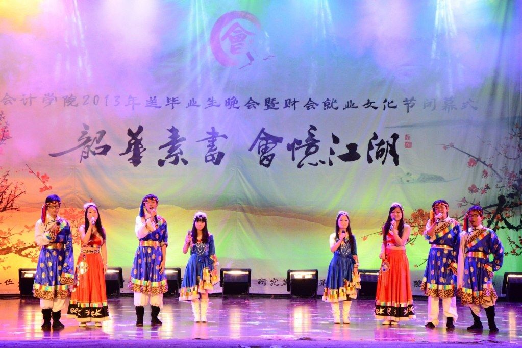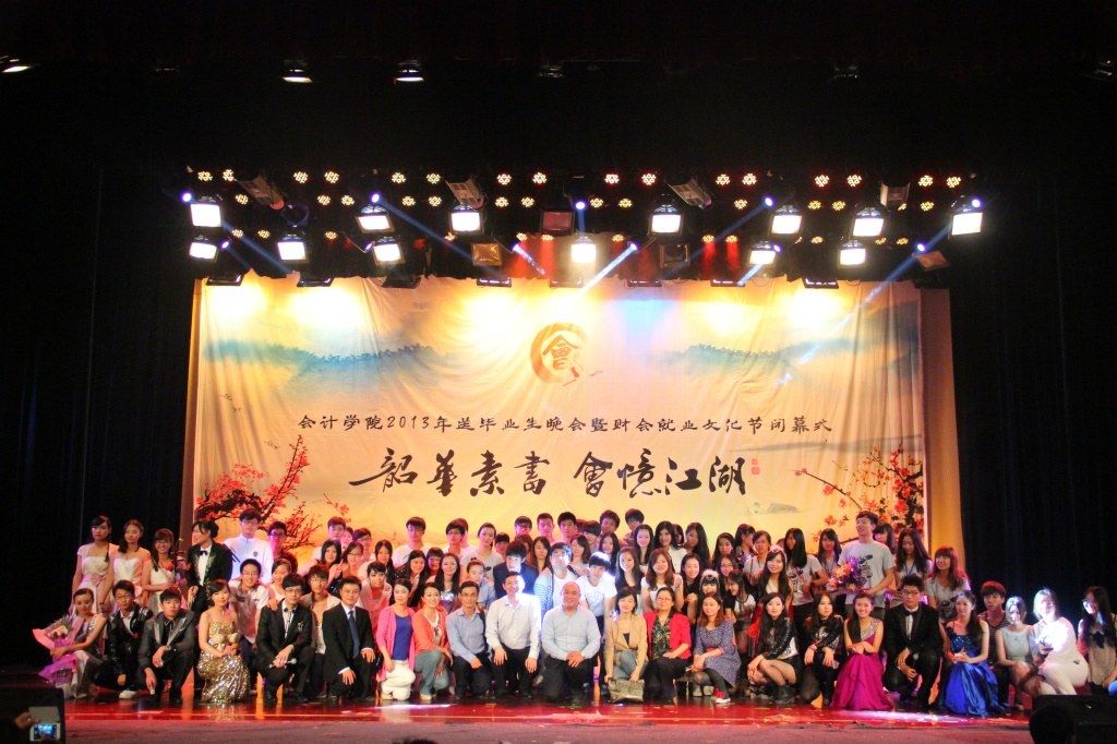 2013年5月30日晚7时,由会计学院团委、学生会、研究生会主办的2013年送毕业生晚会暨第二届财会就业文化节闭幕式在南湖会堂成功举行。出席本场晚会的领导、老师有:中南财经政法大学副校长刘可风教授,校研究生院常务副院长唐国平教授,校保卫部张学平部长,会计学院院长张龙平教授,院党委肖翠祥书记,校党委宣传部邓杨副部长,湖北经济学院会计学院院长李长爱教授一行,博士生导师夏成才教授,院党委王延副书记,会计学院王雄元副院长、王华副院长,会计学院组织员王虎林老师,楚天都市报徐啸寒记者以及会计学院黄洁莉、彭艳、范纯俐、董丽华、刘筱彤、贺欣、陈敏、石中美、王惠芳、徐会超、孟曰、史永、宋丽梦、严丽娜、张昭妍、杨少同、彭岚、毛洪安等老师。毕业生家长代表、用人单位代表、学院各年级学生以及其他学院师生1000余人参加了本次晚会。美承苹果校园体验中心、东方星雅思等单位对晚会给予了支持。