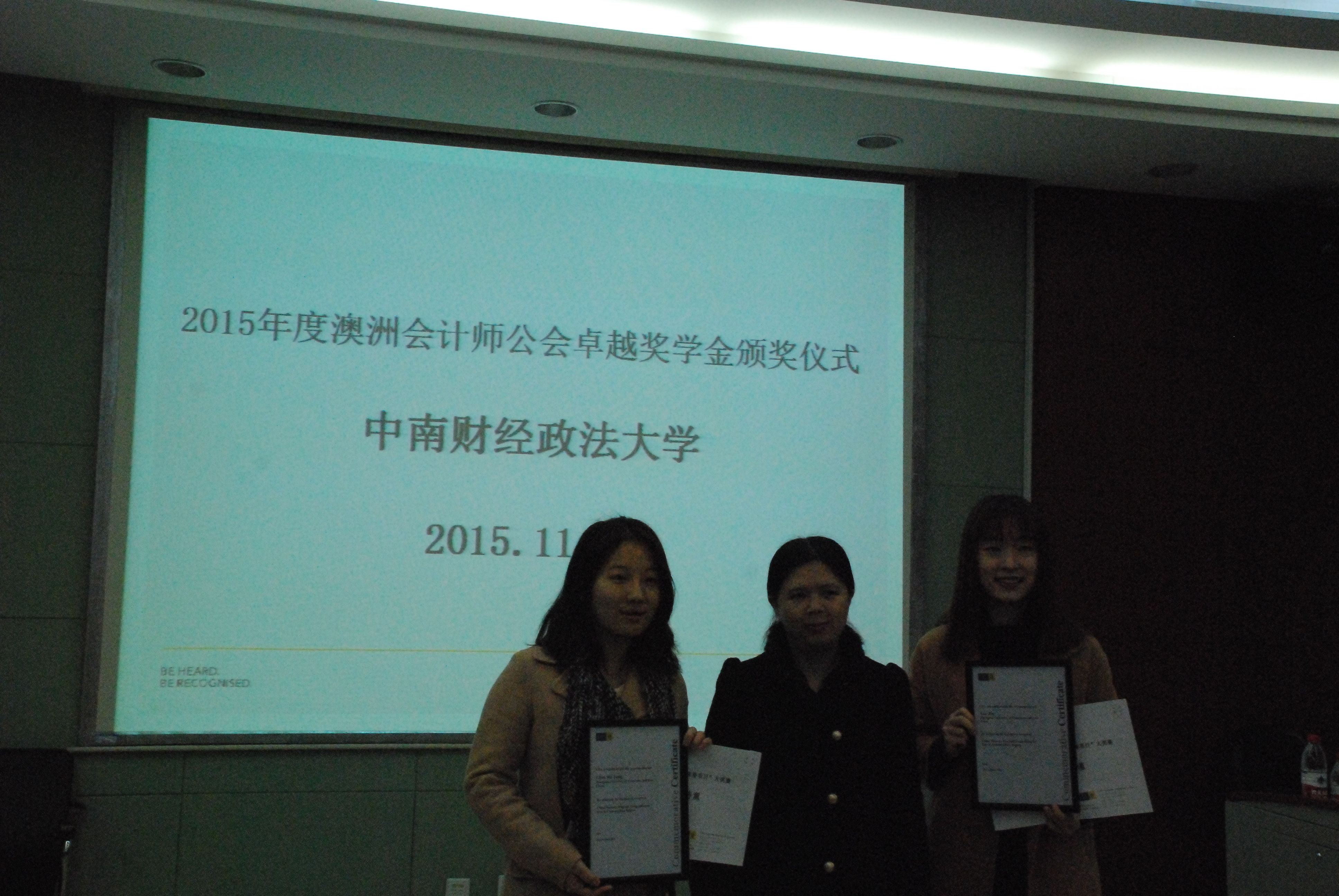 分享会后,我院国际会计教育中心副主任陈辉老师为获得2015年度澳洲会计师公会卓越奖学金的中澳班严谨和陈诗童同学进行颁奖,以表彰她们所取得的优异成绩。
