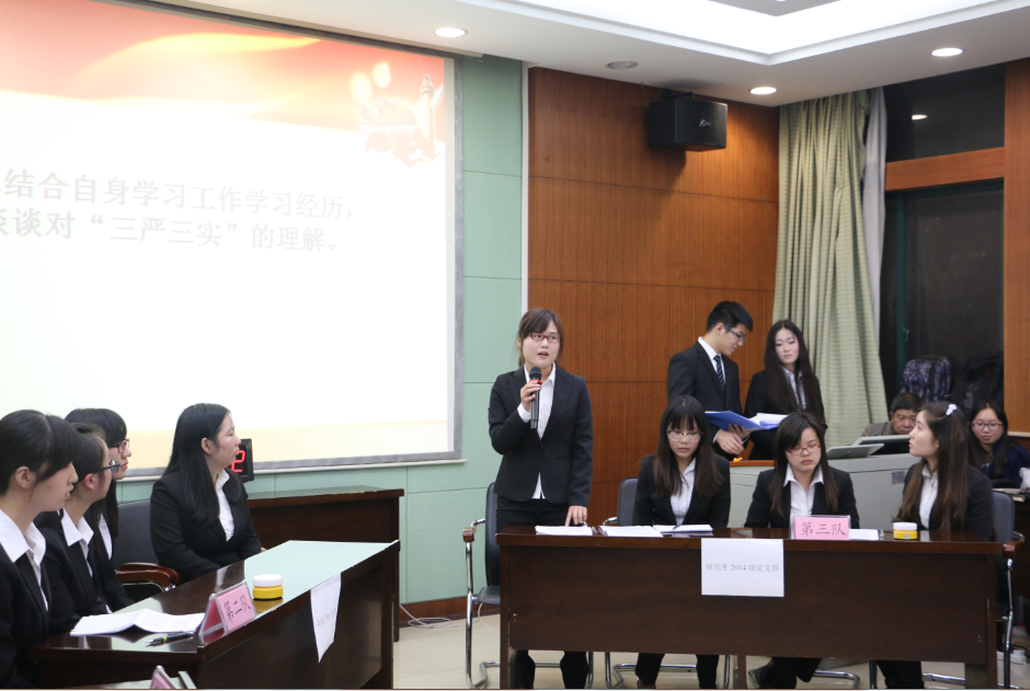 参加决赛的选手们均是经过层层选拔、从2013、2014级本科生党支部和2014、2015级研究生党支部成员中脱颖而出的,每位选手都做好了充分准备。晚六点半,比赛正式开始。比赛共分为三个环节:问答环节、抢答环节和论述环节。比赛题目涵盖了党的十八届五中全会讲话,“三严三实”专题教育,《中国共产党廉洁自律准则》及《中国共产党纪律处分条例》等方方面面。
