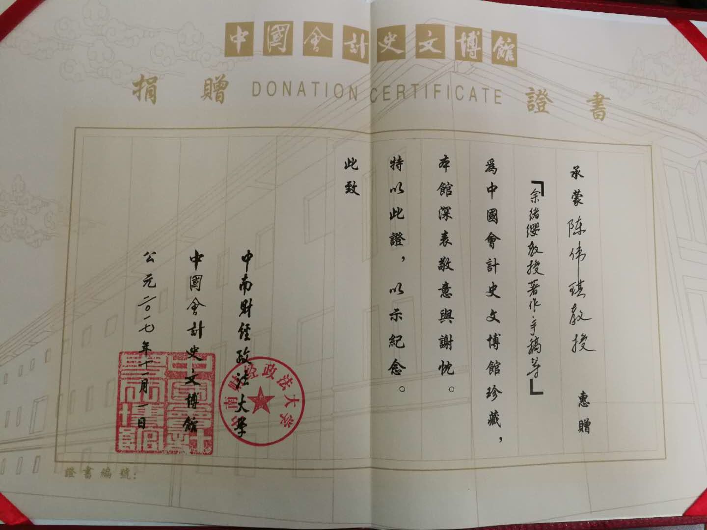 陈伟琪是厦门大学知名教授,在听闻我校正筹建中国会计史文博馆消息后,慷慨捐赠其父亲余绪缨教授著作、手稿、照片等珍贵藏品。余绪缨教授是闻名世界的会计学家,是我国现代管理会计学的泰斗和开创者,本馆能够收藏余教授的展品是我们的荣耀。本馆期待得到更多学者、收藏家及全社会的支持与捐赠,我们将精心做好保管及布展工作,以激励后学进一步推动我国会计事业的发展。