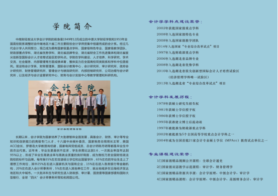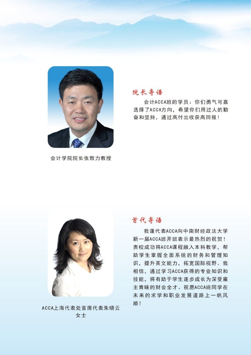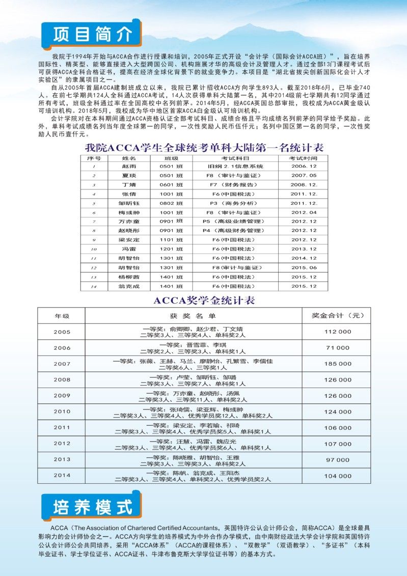 中南财经政法大学与总部设在英国的国际会计职业组织——特许公认会计师公会(The Association of Chartered Certified Accountants,ACCA)自1994年开始合作举办“会计学(国际会计ACCA班)”(以下简称ACCA班),共同培养国际性、精英型、能够直接进入大型跨国公司与机构施展才华的高级会计与管理人才。现在会计学、会计学(注册会计师)、财务管理等3个专业(含方向)招收的本科新生中择优选拔50名学生。
