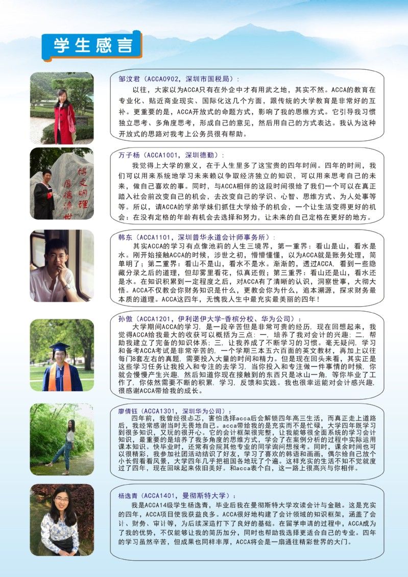 要求条件:入学的会计学、会计学(注册会计师)和财务管理专业本科新生,英语读写能力强、高考成绩优秀、有吃苦耐劳的精神且家庭具有相应的经济承受能力。其中,学生在持续高强度下的学习能力尤为重要。在读ACCA班期间不允许再次转专业,不能参加辅修双学位学习。