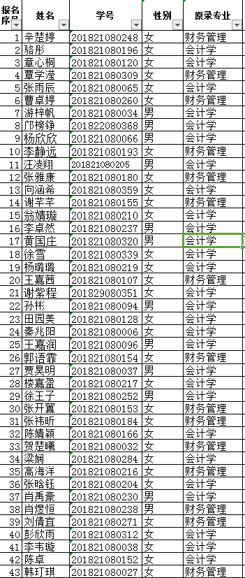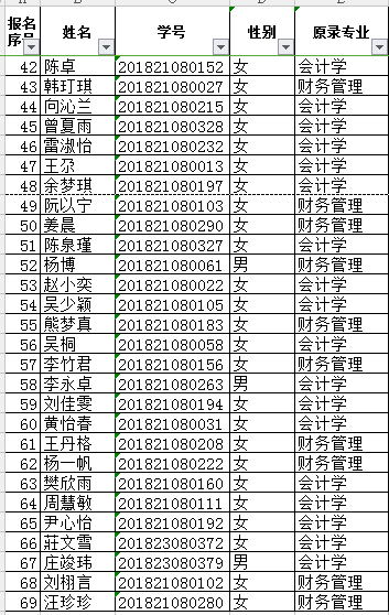 根据《会计学院2018级“会计学(国际会计ACCA班)”招生简章》,截止9月14日,共有70人报名参加会计学(国际会计ACCA班)”(其中一人为非会计学院学生,名单中已剔除)。报名汇总名单如下: