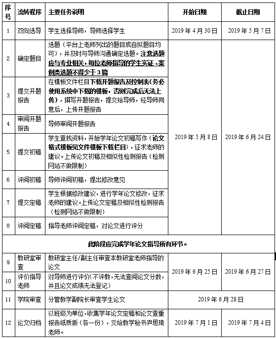 学院已在论文系统中设置各阶段的时间节点(如下表),请指导教师和学生严格遵照相关的时间要求,如学生提交论文资料逾期一次,学年论文成绩建议指导老师扣减5分。 学年论文流转节点