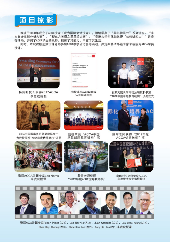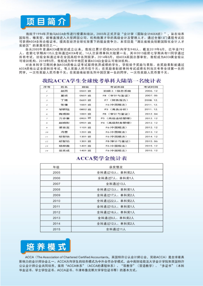 该项目是我校与ACCA自1994年开始共同举办的校际合作项目,经学校批准,会计学院于2005年正式开设ACCA班。该班采用“ACCA体系”、“双教学”和“多证书”的合作与交流模式办学。