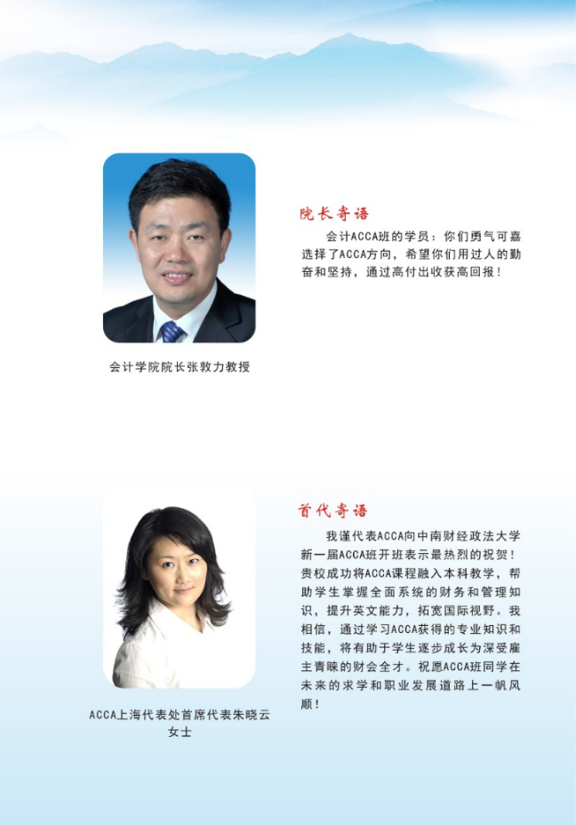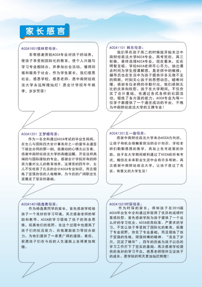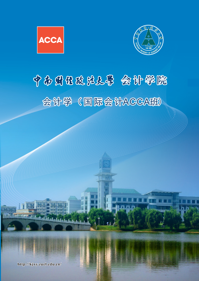 中南财经政法大学与总部设在英国的国际会计职业组织——特许公认会计师公会(The Association of Chartered Certified Accountants,ACCA)自1994年开始合作举办“会计学(国际会计ACCA班)”(以下简称ACCA班),共同培养国际性、精英型、能够直接进入大型跨国公司与机构施展才华的高级会计与管理人才。现在会计学、会计学(注册会计师)、财务管理等3个专业(含方向)招收的本科新生中择优选拔50名学生。