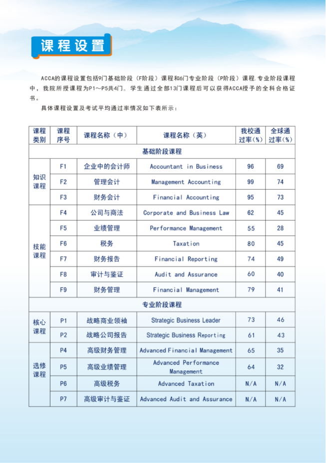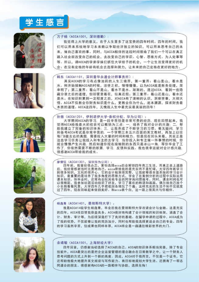 要求条件:入学的会计学、会计学(注册会计师)和财务管理专业本科新生,英语读写能力强、高考成绩优秀、有吃苦耐劳的精神且家庭具有相应的经济承受能力。其中,学生在持续高强度下的学习能力尤为重要。在读ACCA班期间不允许再次转专业,不能参加辅修双学位学习。