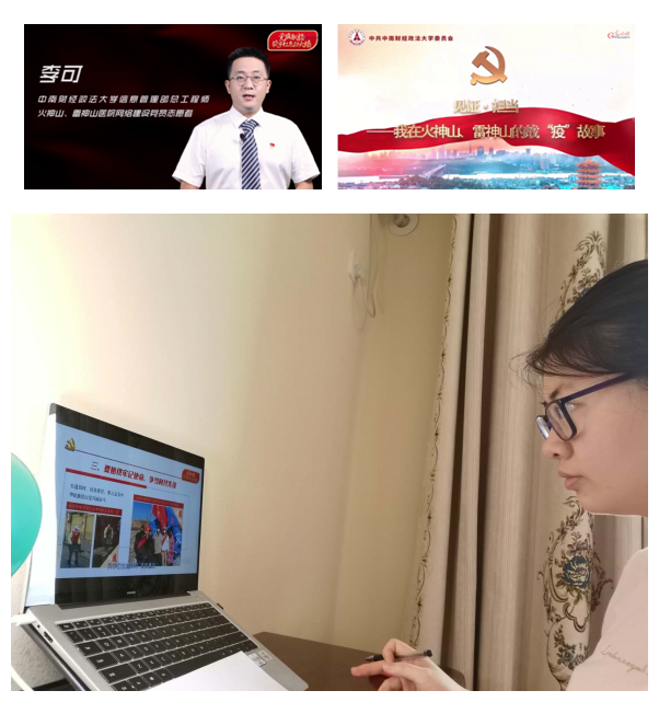 随后,全体党员通过个人观看自学的方式学习全国高校党组织战疫“示范”微党课展播(第五期)。全体党员先后学习了中国石油大学(北京)《为党为祖国为人民贡献青春力量》、天津大学《凝聚战“疫”力量,彰显天大品格》、中南财经政法大学《见证•担当——我在火神山、雷神山的战“疫”故事》、厦门大学《每位大学生都应是有党性、人民性的青年新闻人》、华中农业大学《耕读中国——战“疫”中的助农故事》。其中,在学习完《见证•担当——我在火神山、雷神山的战“疫”故事》后,大家被李可讲述的自身参与火神山、雷神山建设的经历所感动,也被90后便利店店长等普通民众所感动。