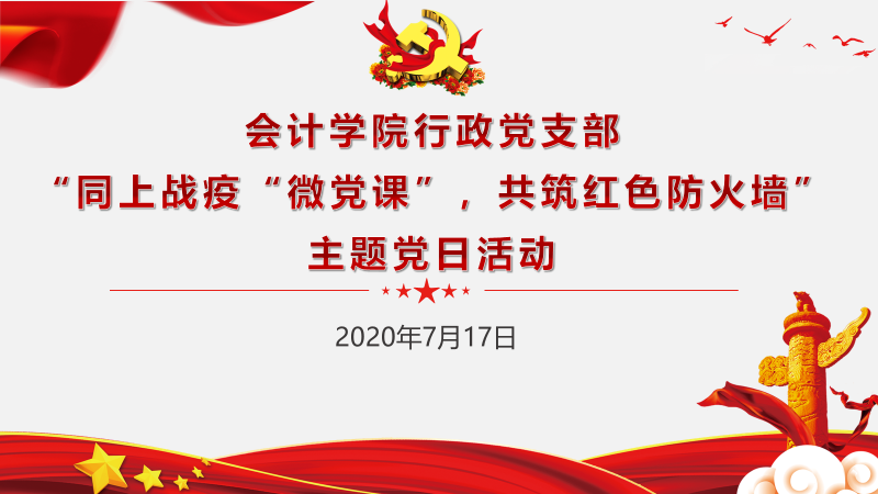 2020717日上午9:30,会计学院行政党支部在企业微信线上开展了七月份“同上战疫‘微党课’,共筑红色防火墙”支部主题党日活动,会议由支部副书记陈楠同志主持,院党委书记殷修林同志、党委副书记王延、徐会超同志及行政党支部的其他党员同志们参加了会议。