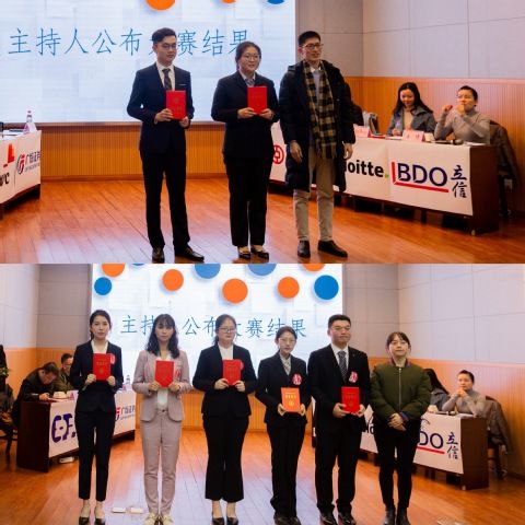该环节结束后,每个小组进入“职场步步高”环节。选手将按前两个环节分数排名情况两两依次上台,现场抽取题包,通过即兴演讲发表观点,展示风采,企业代表则针对选手表现作出专业点评。在最后的 “职场终选择” 环节,各个企业代表们在经过充分考虑后选择是否为某个选手亮灯,若多家企业同时为一位选手亮灯则选手可以反向选择心仪实习企业。经过双向选择,每位选手都得到了心仪企业的offer,获得了宝贵的实习机会。最后根据选手们的表现,评委们还选出了本次比赛的优秀选手,由会计学院团委书记张昭妍老师、陈俊华老师为他们颁奖。