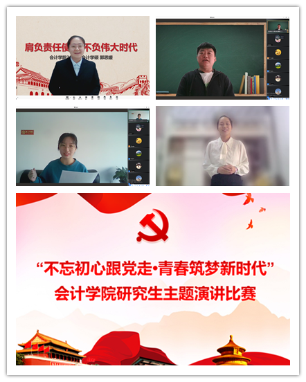10月25日中午,为进一步学习宣传习近平新时代中国特色社会主义思想和党的十九大精神,深入学习贯彻习近平总书记在庆祝中国共产党成立 100 周年大会上的重要讲话精神和党史学习教育动员大会上的重要讲话精神,同时丰富研究生党建活动形式和载体,引导研究生牢固树立“四个意识”,坚定“四个自信”,展现研究生群体奋发向上的精神风貌,会计学院(会硕中心)结合防疫形式,通过线上形式开展了“不忘初心跟党走•青春筑梦新时代”研究生主题演讲比赛,经过激烈的角逐,学硕2021级学生郭思媛、宋懿宸分别凭借题为《肩负责任使命 不负伟大时代》、《不忘初心 筑梦青春》的主题演讲,荣获大赛一等奖。