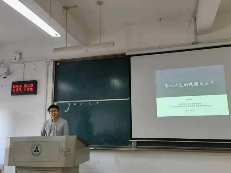 随后,特邀嘉宾、会计学院学硕导师组组长杨国超教授为同学们带来“论文的选题与写作”专题讲座。杨国超教授介绍了论文选题的重要性,以自身投稿的经历为例,指出论文选题需要做到“以小见大”。接着,杨国超教授对目前同学们选题普遍存在的问题进行分析,他认为同学们论文的选题一定要“有足够多的人感兴趣”,当论文的选题足够有意义的时候,论文的写作才会充满动力。在内容写作方面,杨国超教授认为,同学们应加强相关文献的阅读,他指出:“没有一篇完全全新的论文”,充分阅读相关文献对同学们论文内容的写作大有脾益。互动环节中,在场同学积极踊跃地举手提问,对于论文写作的相关问题提出自己的困惑,杨教授以自己丰富的经验,为同学们耐心解答了相关问题。同学们纷纷表示受益匪浅,意犹未尽。