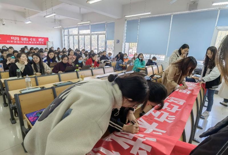 首先,在“崇尚科学道德,坚守学术诚信”承诺环节,参与线下讲座的研究生代表在横幅上签名,对今后遵循学术道德,恪守学术诚信做出了自己的庄严承诺。