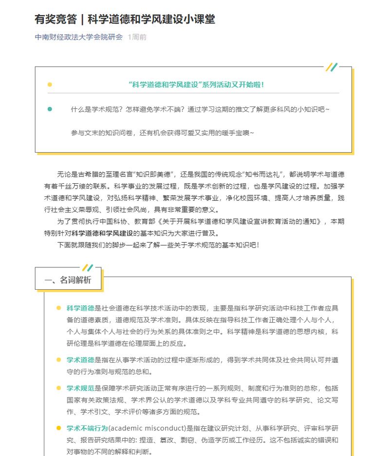 活动的第三项是线上“科学道德和学风建设知识普及大赛”有奖竞答活动的颁奖仪式。为增强活动实效性,此前会计学院研究生会学术部通过公众号开展了科学道德和学风建设小课堂、有奖竞答等活动,激励同学们培养学风道德,践行学术诚信精神。