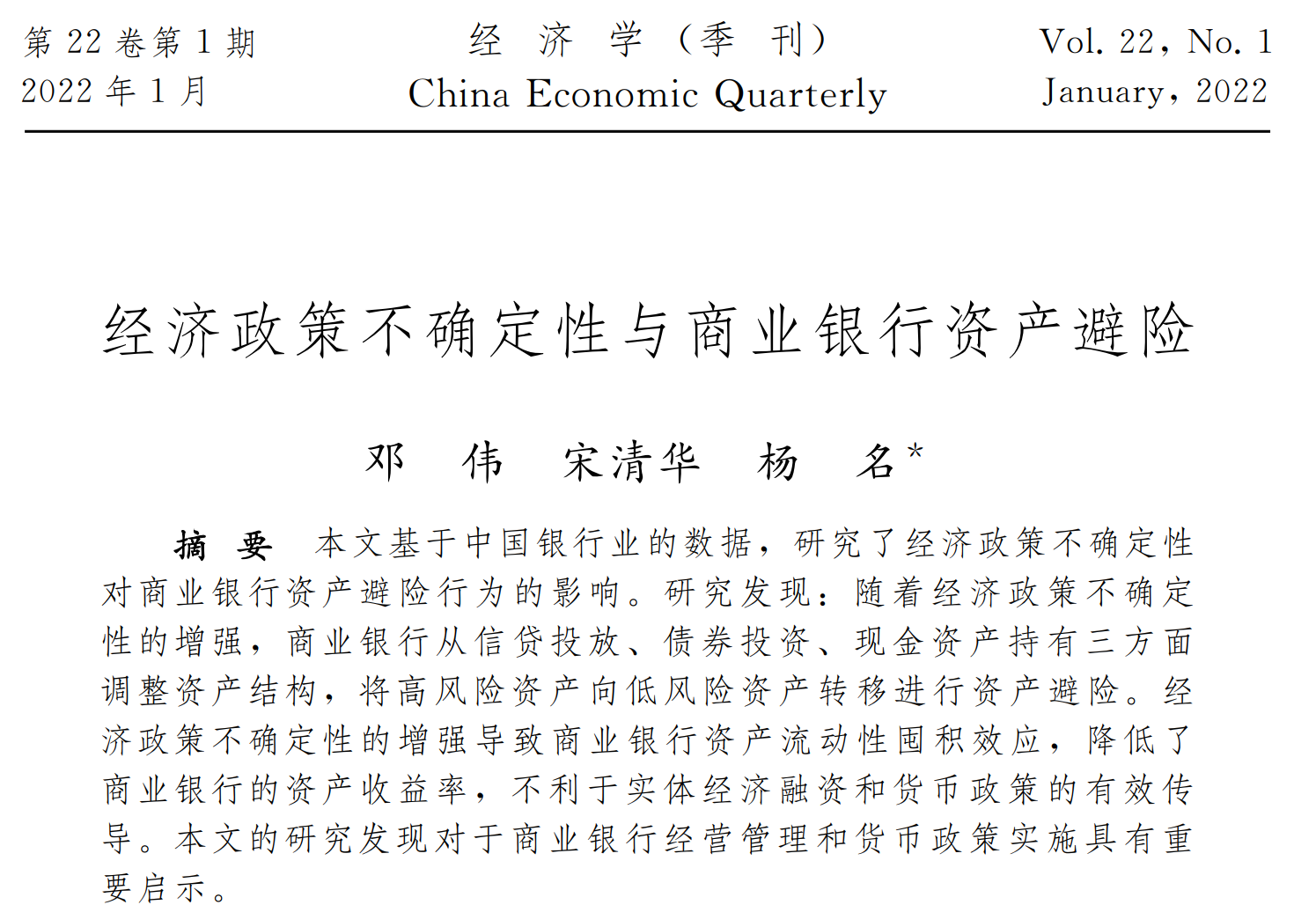 近日,由会计学院2018级学术型硕士研究生杨名及其导师邓伟副教授、金融学院宋清华教授合作完成的论文“经济政策不确定性与商业银行资产避险”被《经济学(季刊)》正式接受并发表。《经济学(季刊)》是由北京大学主管、北京大学中国经济研究中心主办、北京大学出版社出版的经济学综合性刊物,该刊发表原创性的理论、经验、综述和评论性的中文经济学论文,是我校认定的A-期刊。