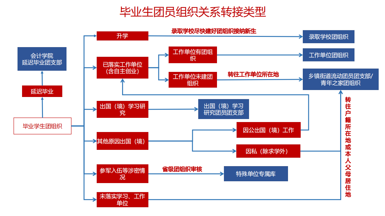 6.出国(境)工作的毕业学生团员:因公出国(境)的毕业学生团员,在出国(境)前将个人团组织关系转至派出单位的团组织。因私出国(境)的毕业学生团员(求学除外),在出国(境)前将个人团组织关系转接至户籍所在地或本人、父母居住地的乡镇街道团组织。