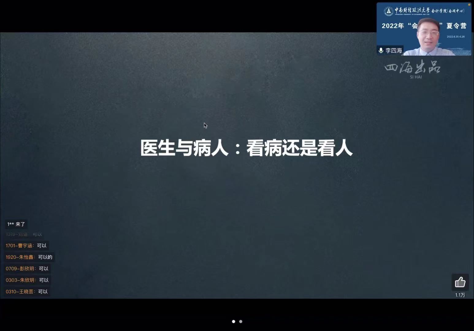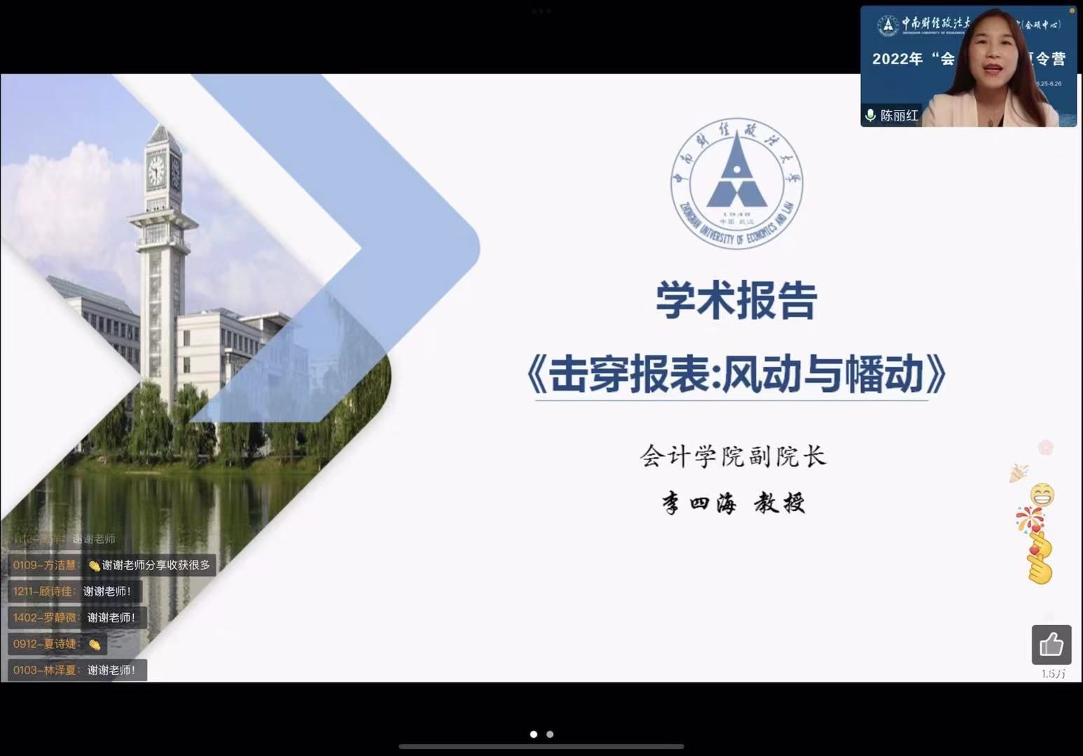 6月25日上午9点30分,2022年“会人会语”文澜优秀大学生夏令营学术报告会在线上平台拉开帷幕,会计学院副院长,教授,博士生导师李四海老师做了第一场学术报告《击穿报表:风动与幡动》,会计学院副院长陈丽红教授主持本场学术报告会,近500多名师生参加了此次活动,同学们热情高涨,认真聆听着李四海教授的报告,并积极发表自己的意见与看法。
