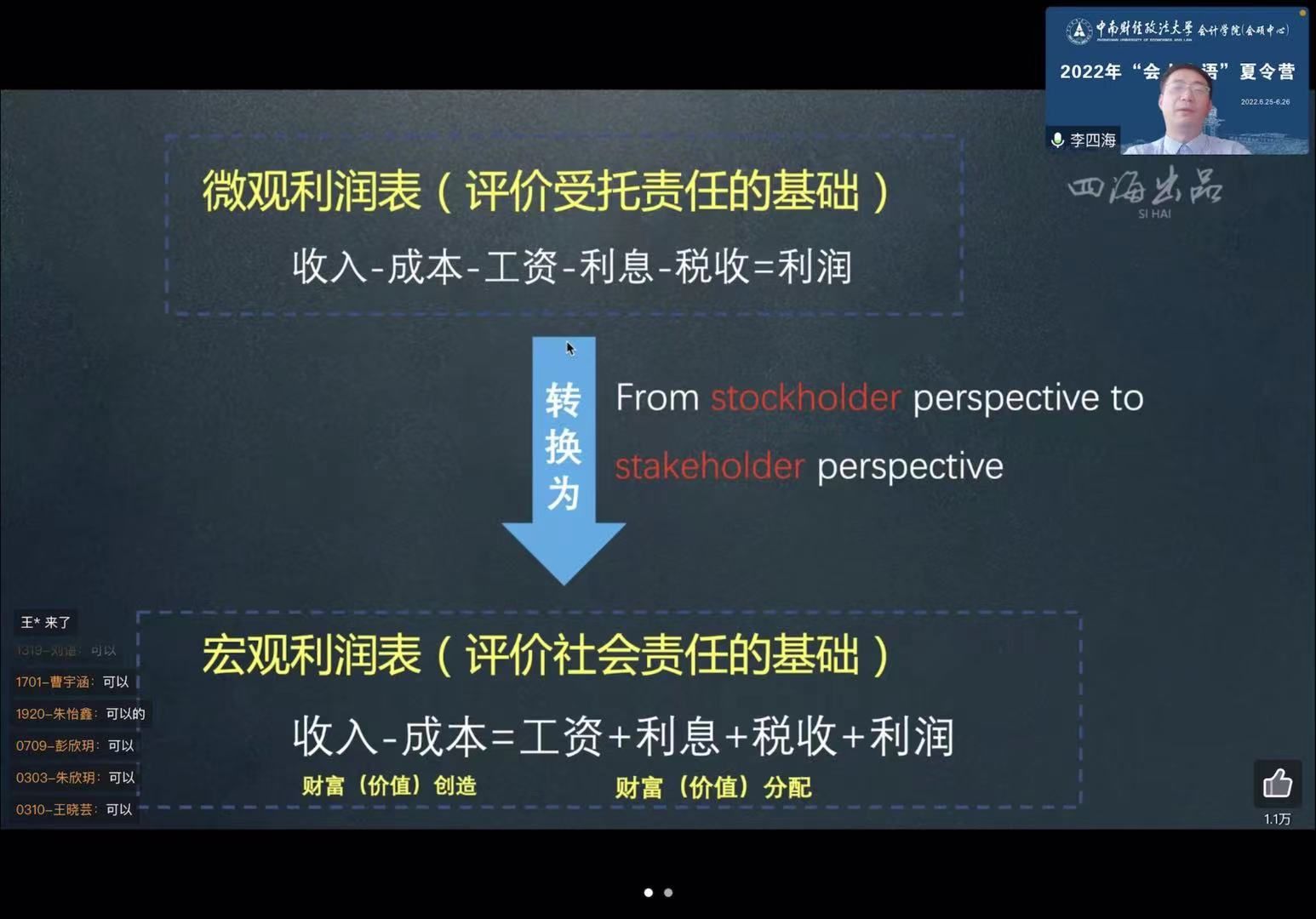随后,李四海教授以“收入-成本=利润”的基本会计恒等式为起点,带领同学们穿透报表的迷雾,从微观利润表和宏观利润表角度去解读企业价值的创造和分配过程,并且引领同学们去思考轻资产的运营模式,大数据的平台和餐饮行业的经营逻辑。